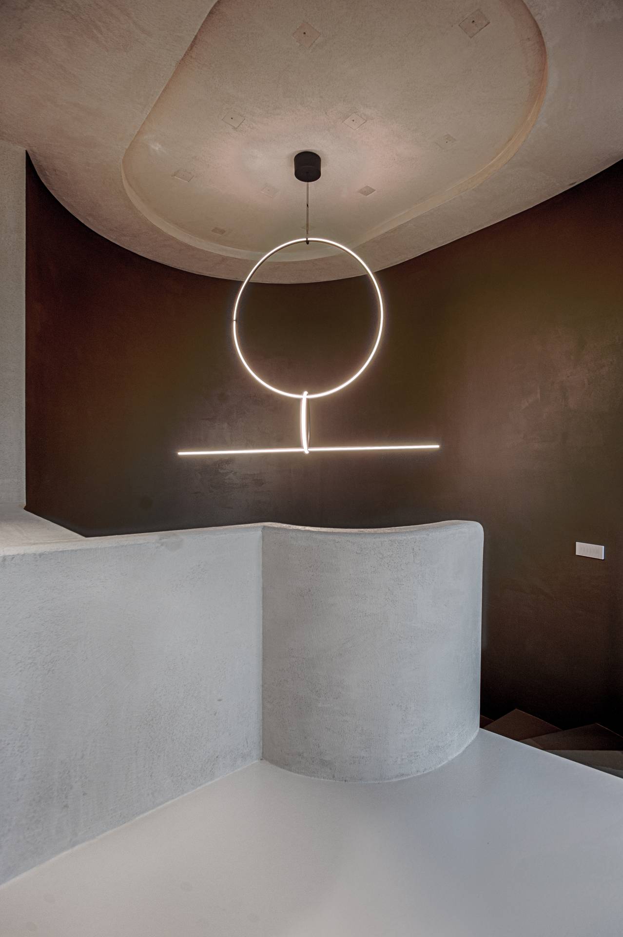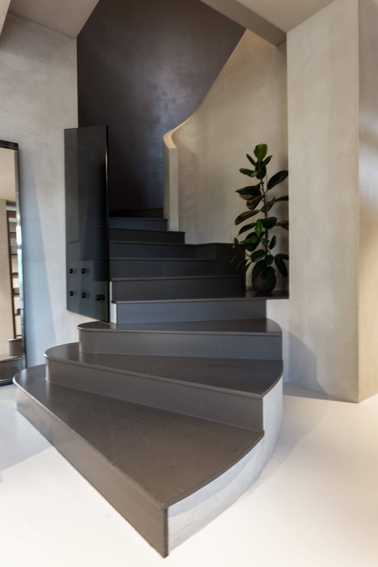 I colori scelti per i pavimenti le pareti sono neutri e tono su tono, declinati in varie matericità: resina, intonachino e tessuti.