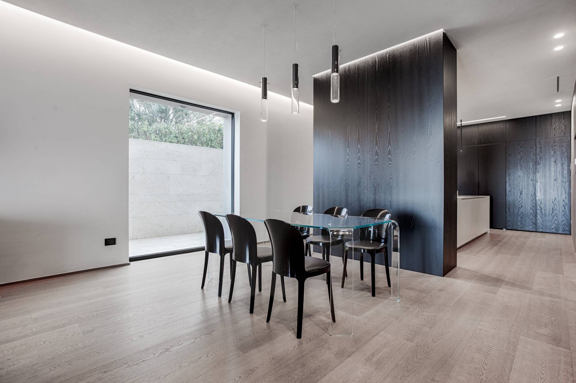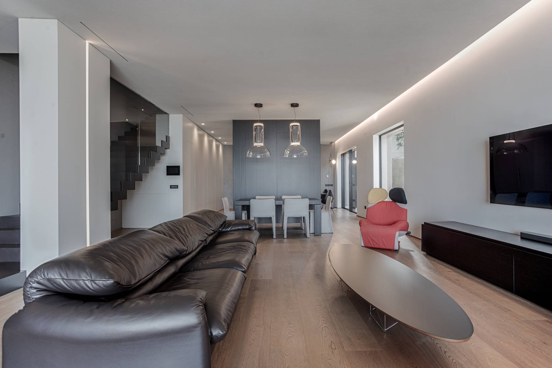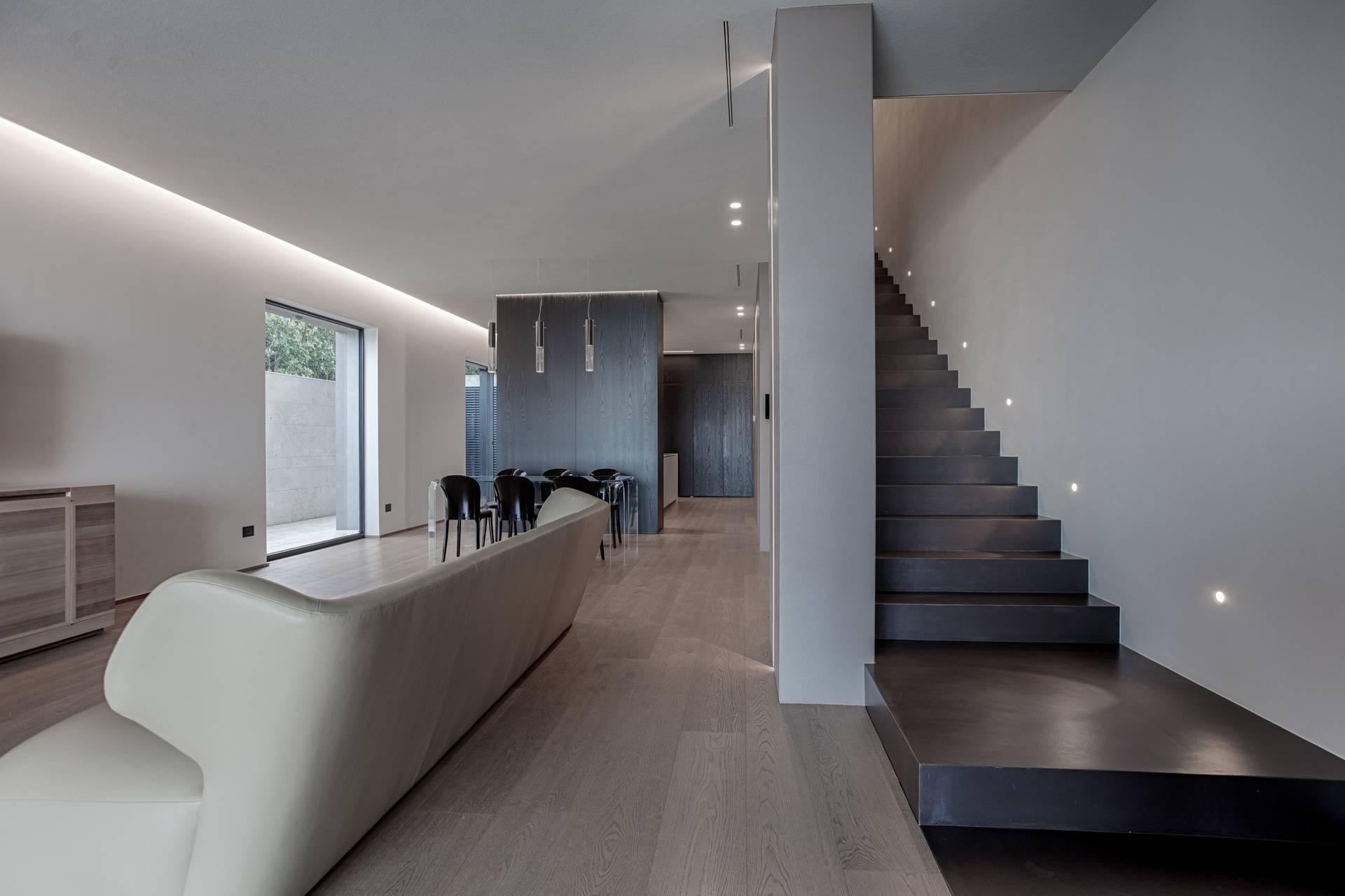 In questo modo il piano terra sfocia naturalmente nel giardino con ampie zone esterne dedicate al relax e un soggiorno en plein air.