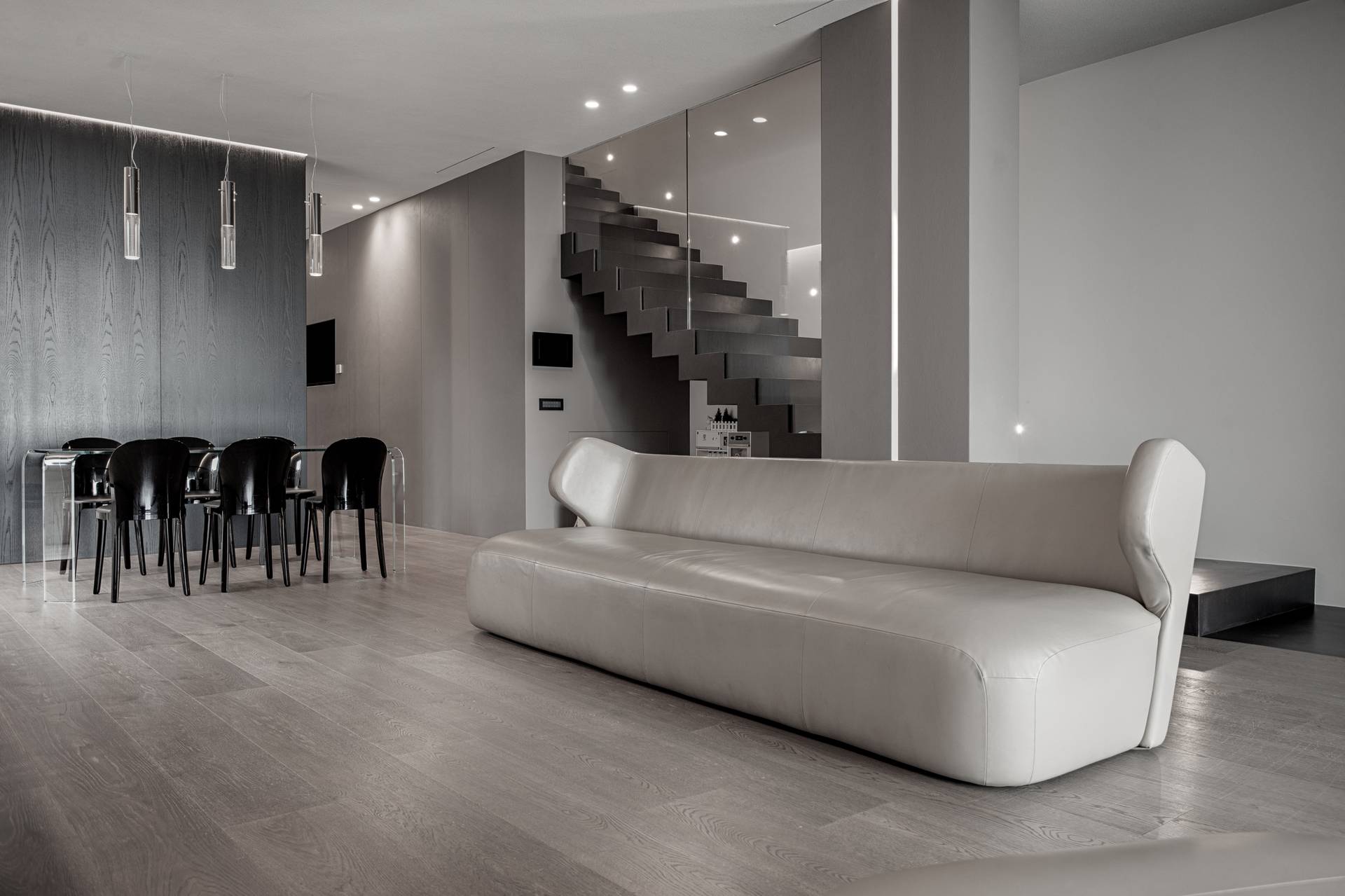 Le due abitazioni, molto simili per forma e dimensioni, sono state realizzate con gli stessi materiali e uno stesso mood che viene poi declinato nell’arredo e nelle funzioni, in base al confronto con i diversi committenti, al loro gusto e alle loro esigenze.