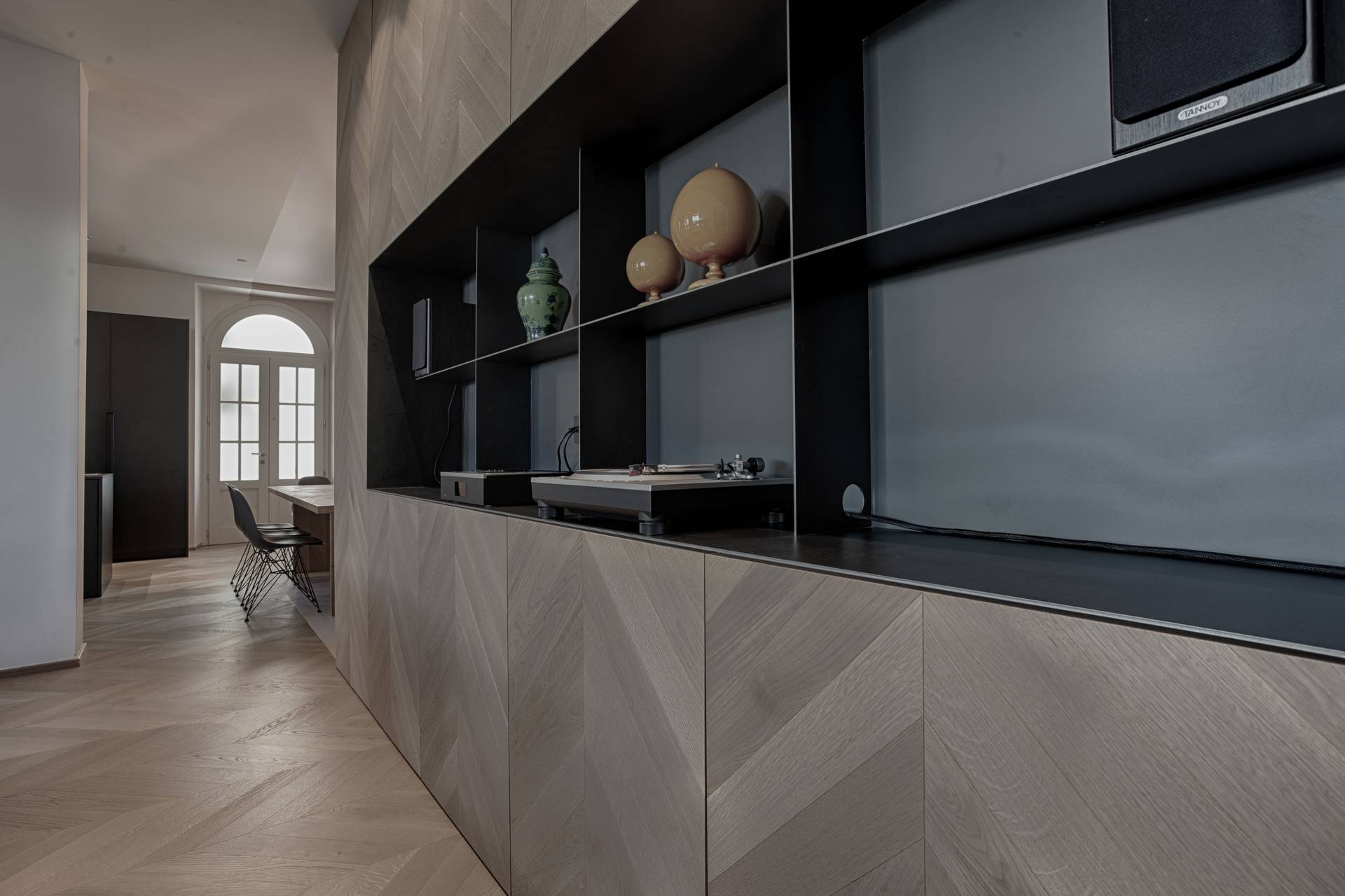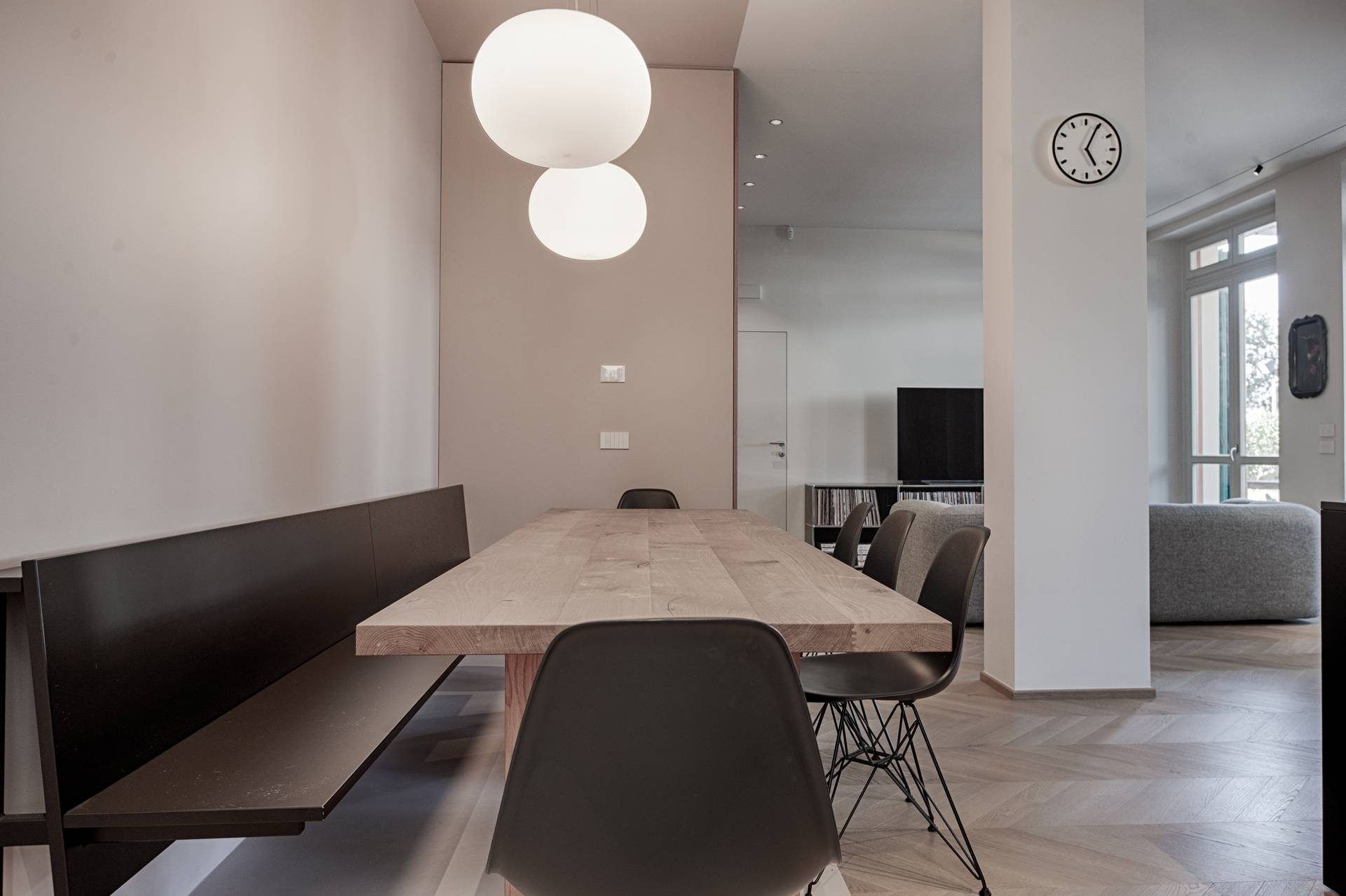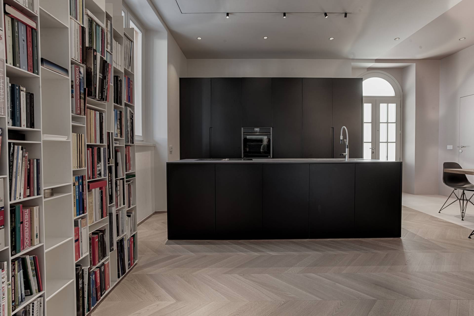 La libertà progettuale è stata totale: da qui la scelta di colori e materiali in contrasto tra loro, ma che illuminano e danno un carattere più giovanile allo spazio. Il segreto è infatti nei dettagli, come il parquet a spina che risale nel mobile giorno contenitore, il nero della cucina, che da un tocco geometrico e più astratto alla stanza, le texture e i materiali, dal legno del pavimento e del mobile al metallo e al laccato.
