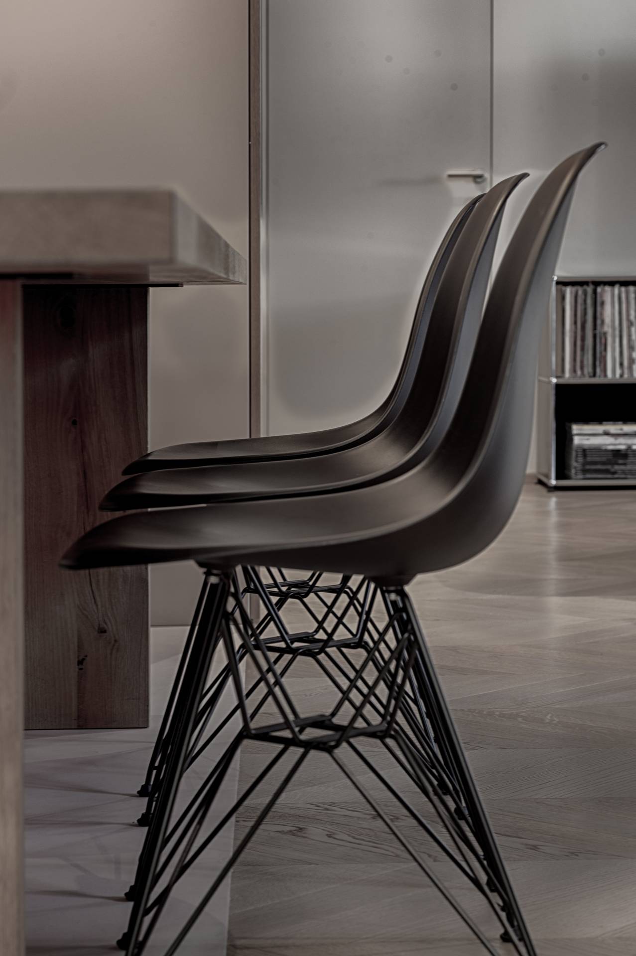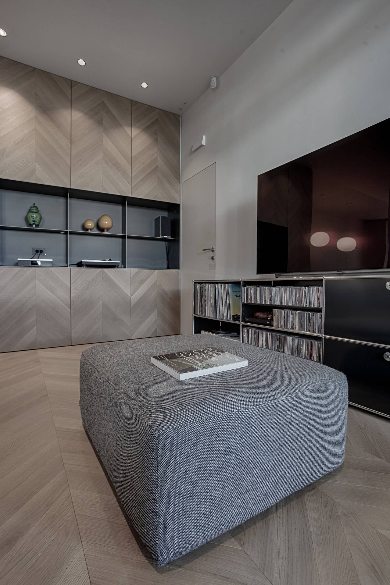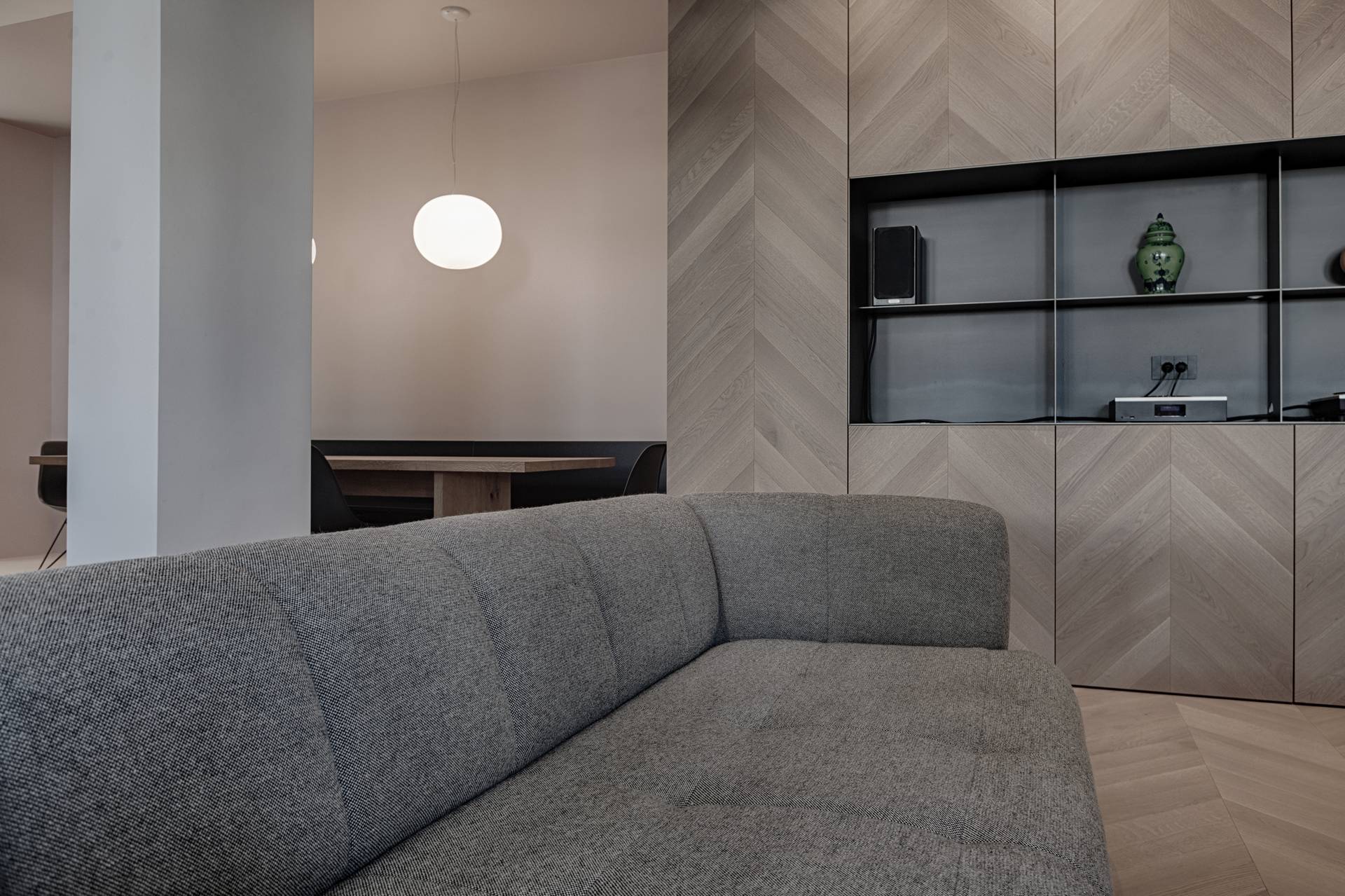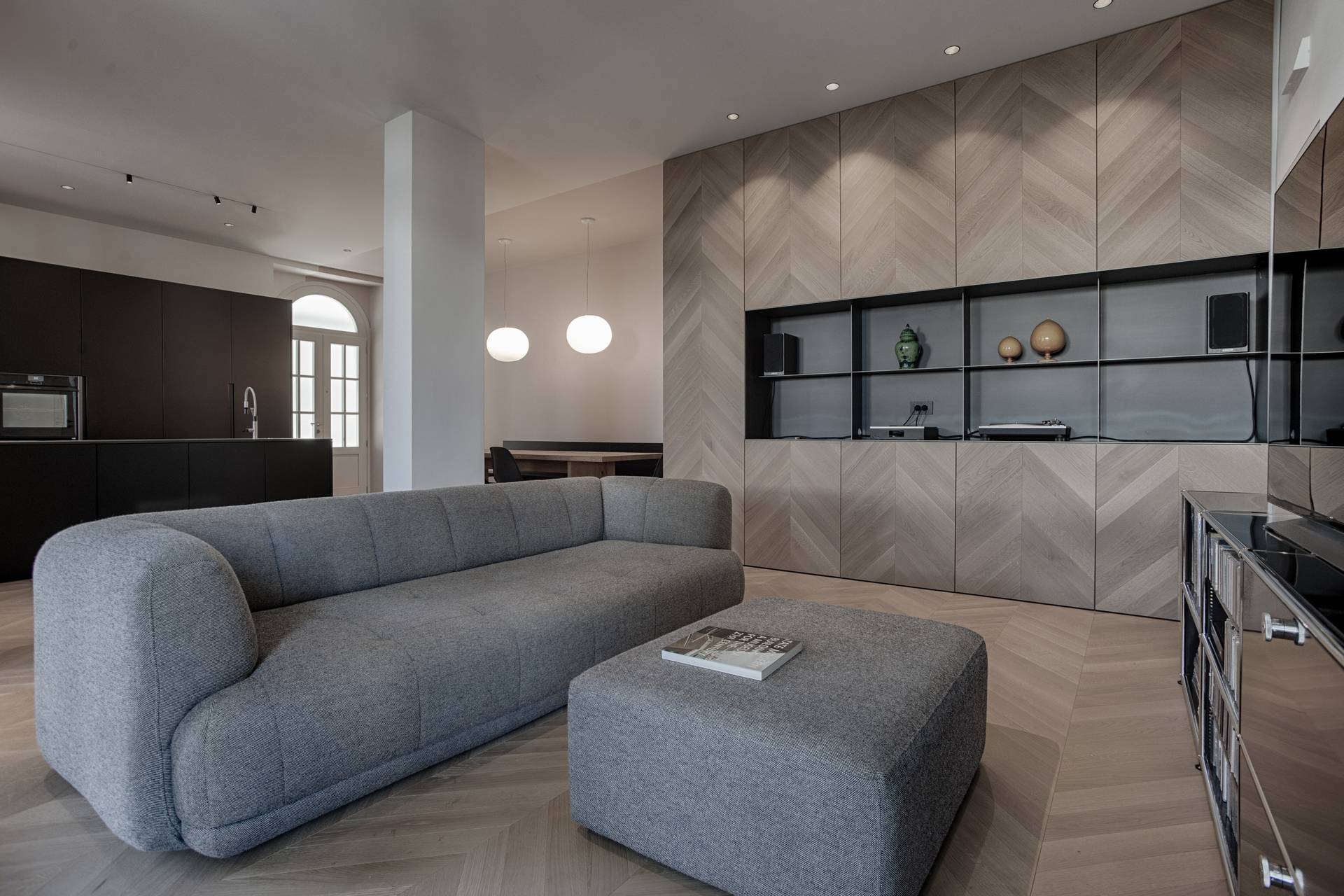 La libertà progettuale è stata totale: da qui la scelta di colori e materiali in contrasto tra loro, ma che illuminano e danno un carattere più giovanile allo spazio. Il segreto è infatti nei dettagli, come il parquet a spina che risale nel mobile giorno contenitore, il nero della cucina, che da un tocco geometrico e più astratto alla stanza, le texture e i materiali, dal legno del pavimento e del mobile al metallo e al laccato.