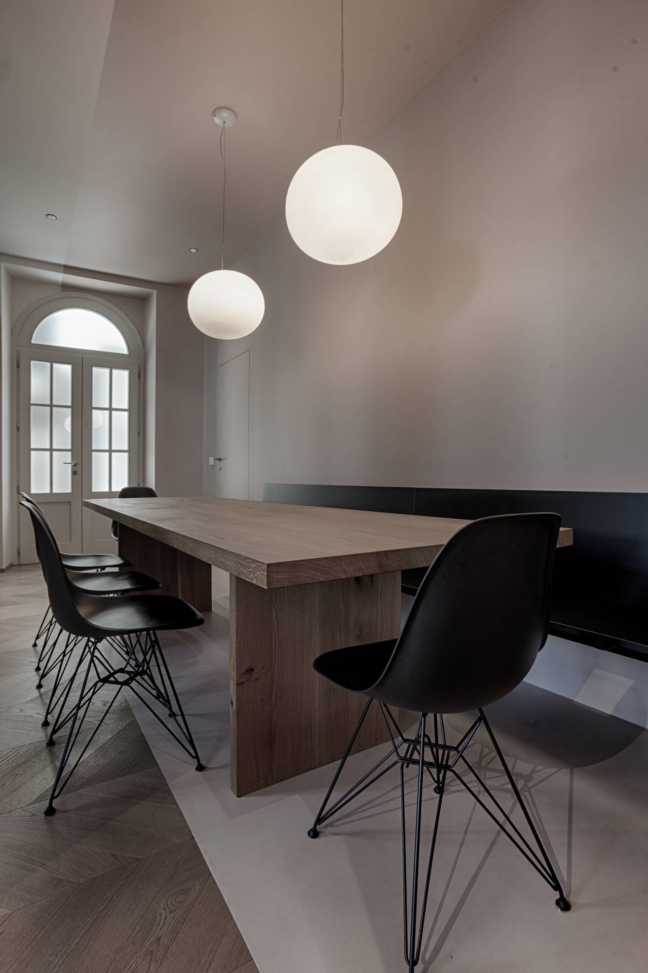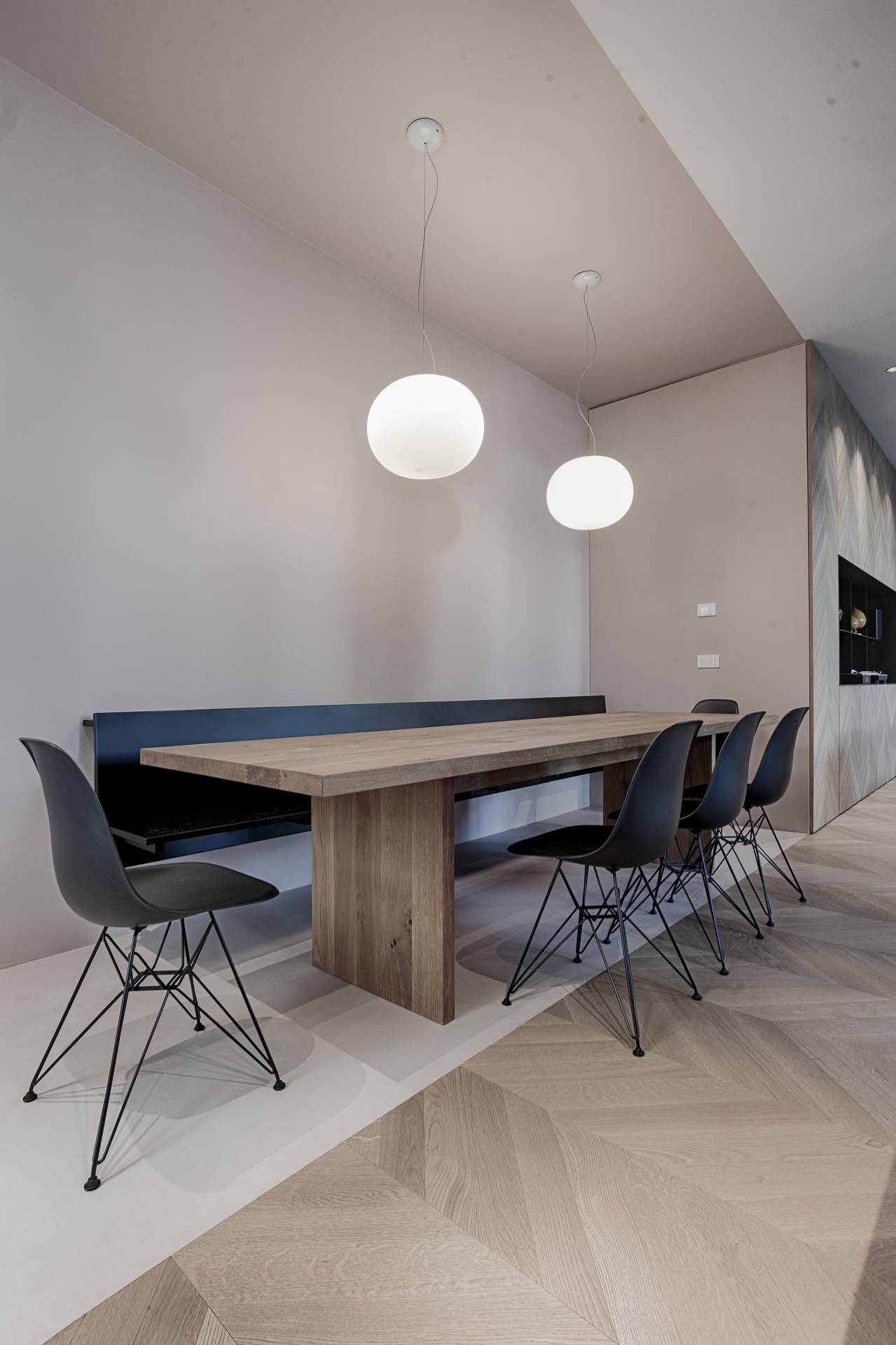 Protagonista indiscusso, il tavolo avvolto di rosa, dal pavimento al soffitto e alle pareti, concentra tutta l’attenzione sulla zona dining, rendendo unico e originale l’ambiente pensato.