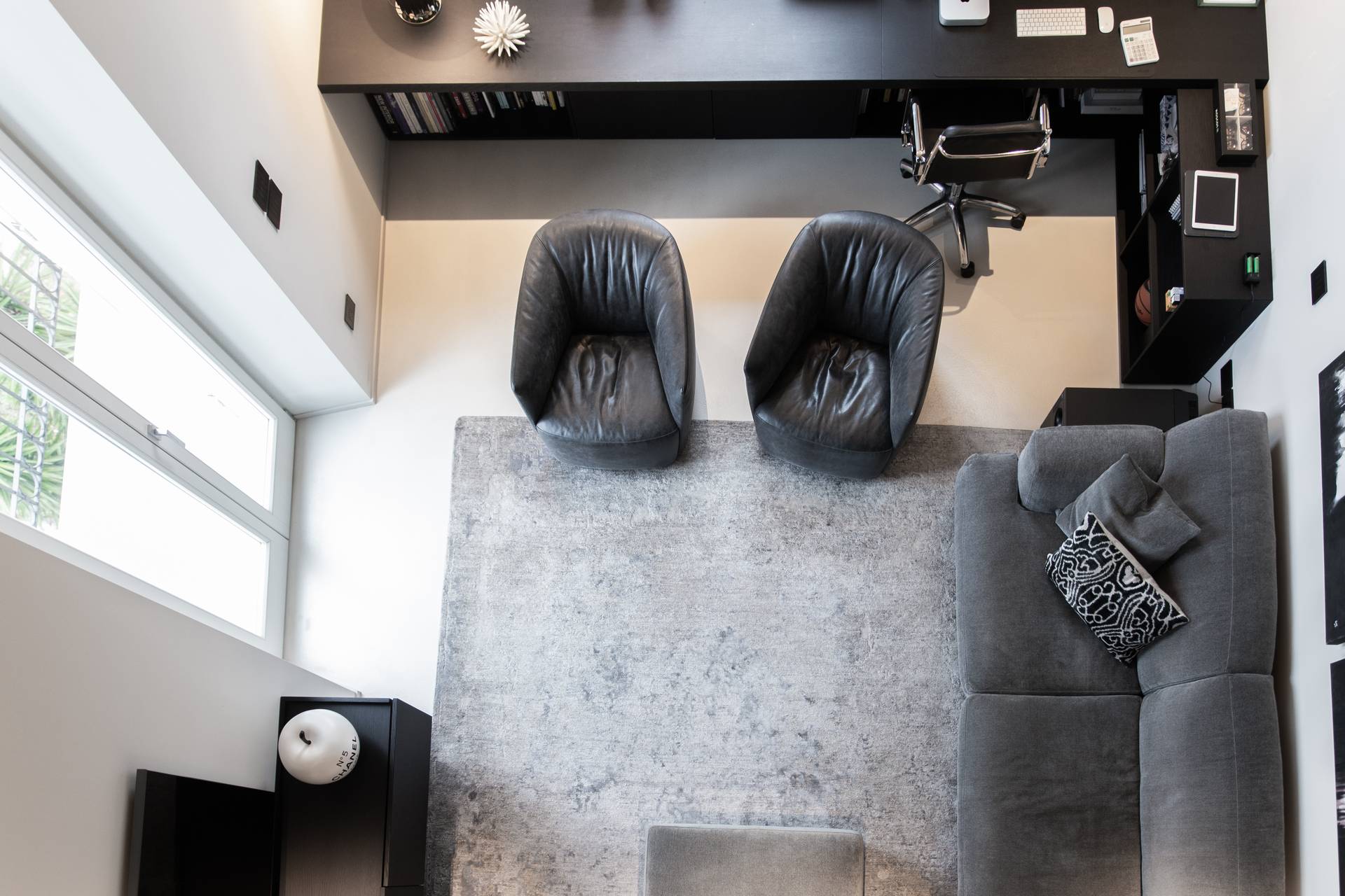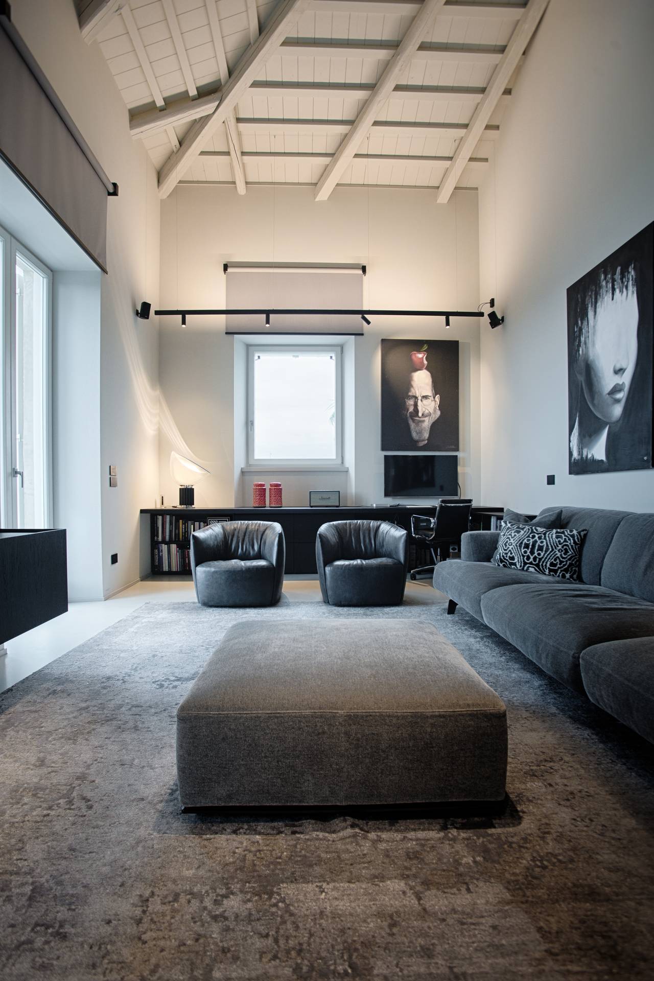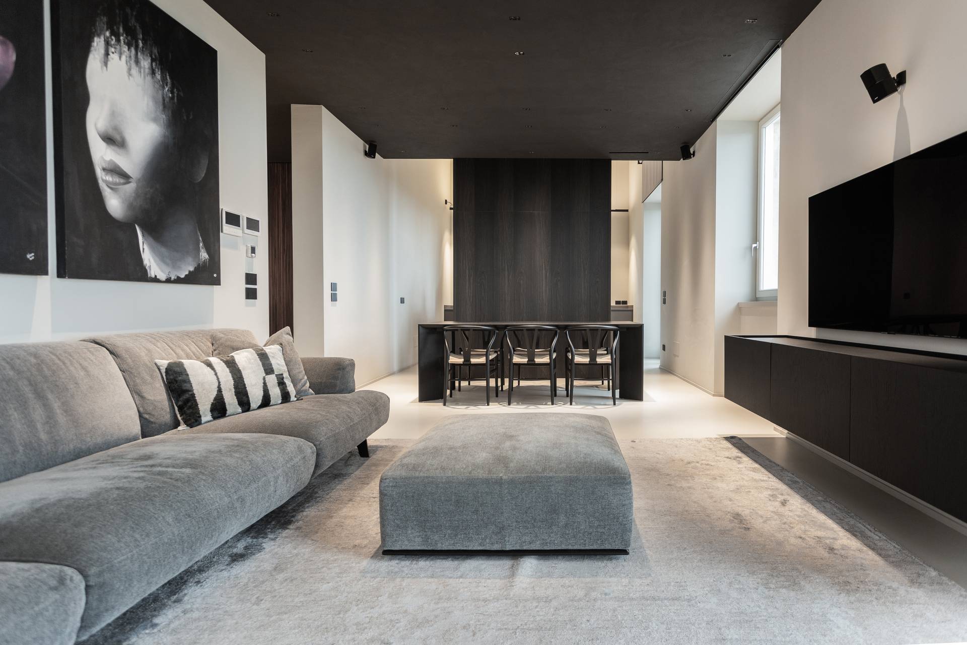Uno degli aspetti che caratterizza il progetto è senza dubbio lo studio meticoloso della luce naturale. L’altezza dei soffitti e le alte finestre permettono alla luce di entrare nel soggiorno e di cambiare gradualmente l’atmosfera della stanza con il passare delle ore. Per filtrare questa luce, le pareti sono state delicatamente intonacate con una tonalità di grigio, che conferisce un carattere più intimo e ammorbidisce le forme decise degli arredi. Arredi che diventano architettura, declinandosi in pareti divisorie.