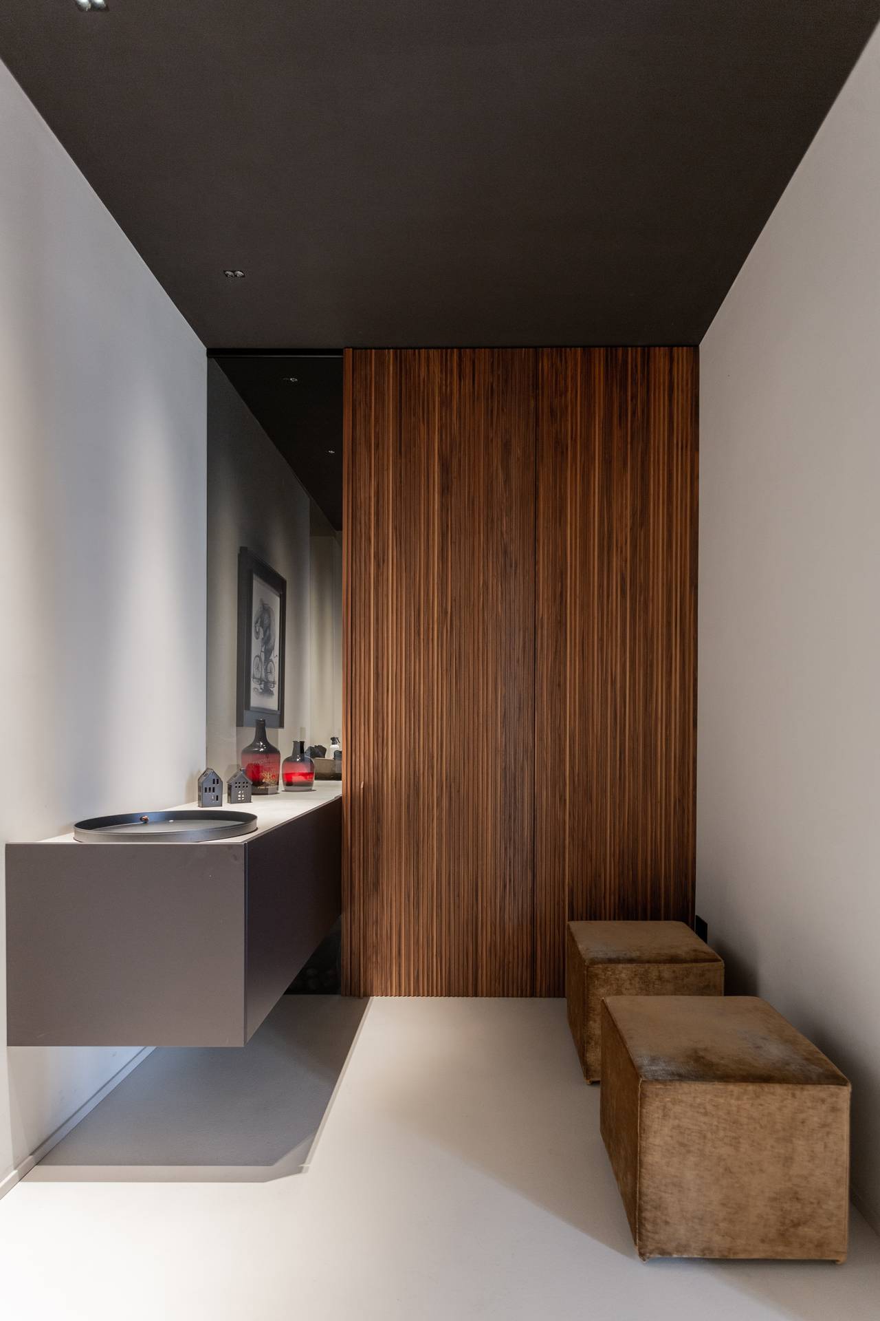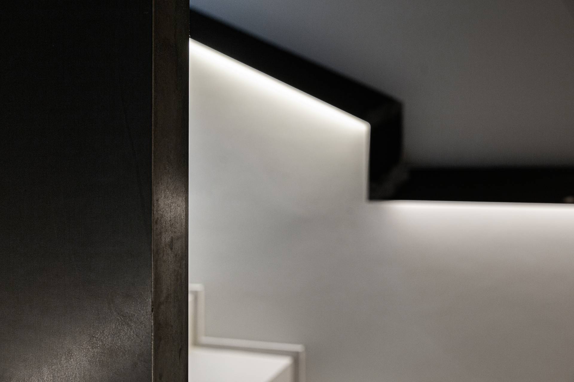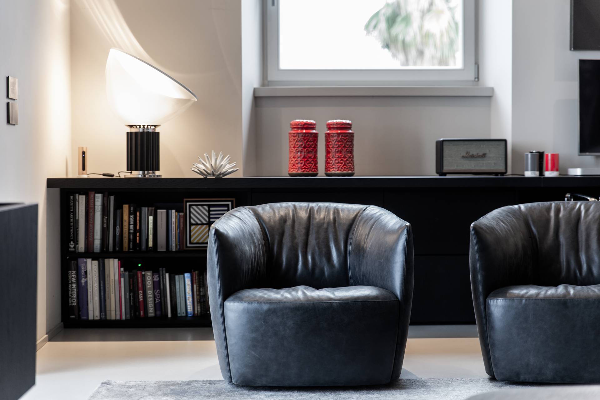 Uno degli aspetti che caratterizza il progetto è senza dubbio lo studio meticoloso della luce naturale. L’altezza dei soffitti e le alte finestre permettono alla luce di entrare nel soggiorno e di cambiare gradualmente l’atmosfera della stanza con il passare delle ore. Per filtrare questa luce, le pareti sono state delicatamente intonacate con una tonalità di grigio, che conferisce un carattere più intimo e ammorbidisce le forme decise degli arredi. Arredi che diventano architettura, declinandosi in pareti divisorie.