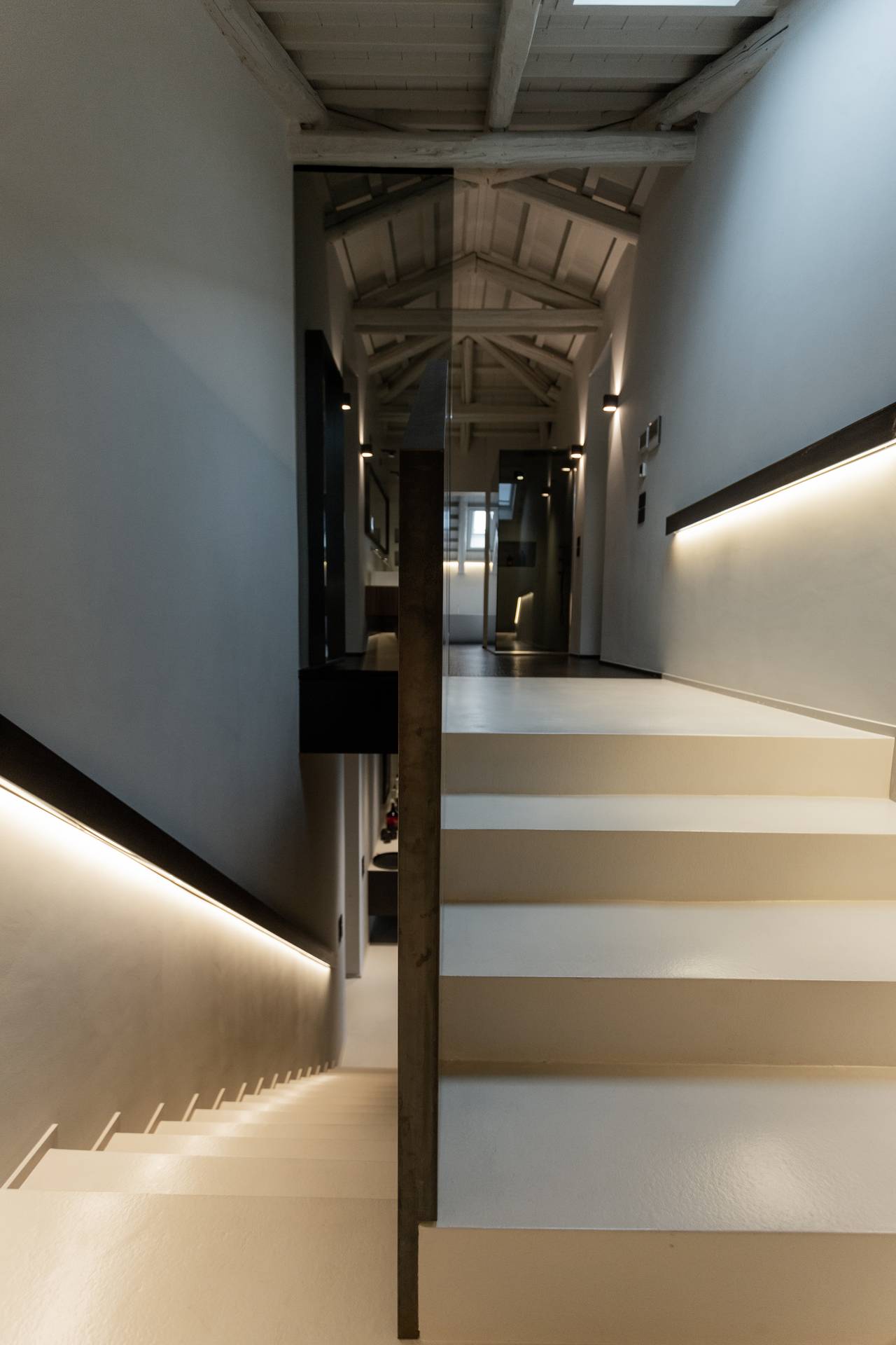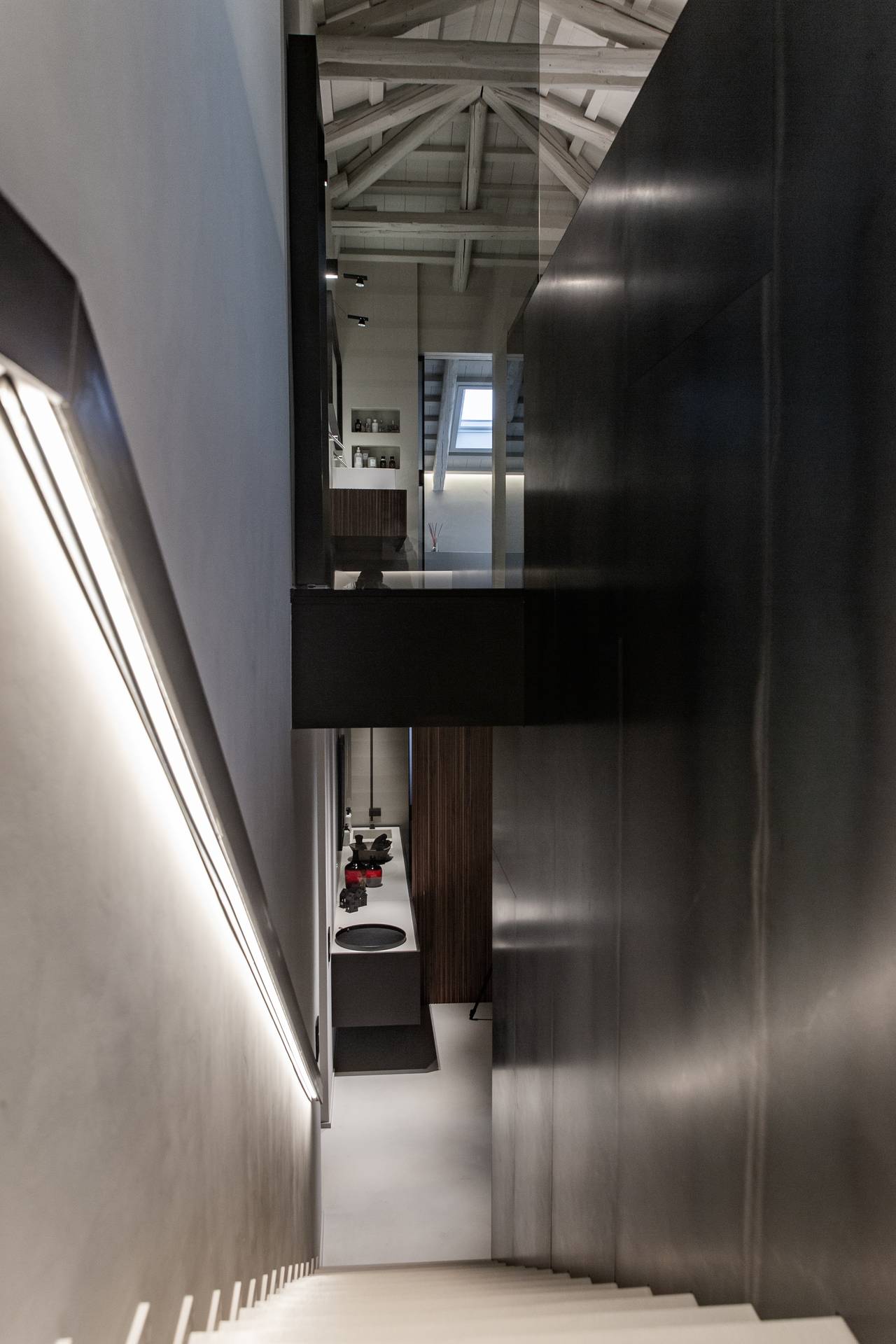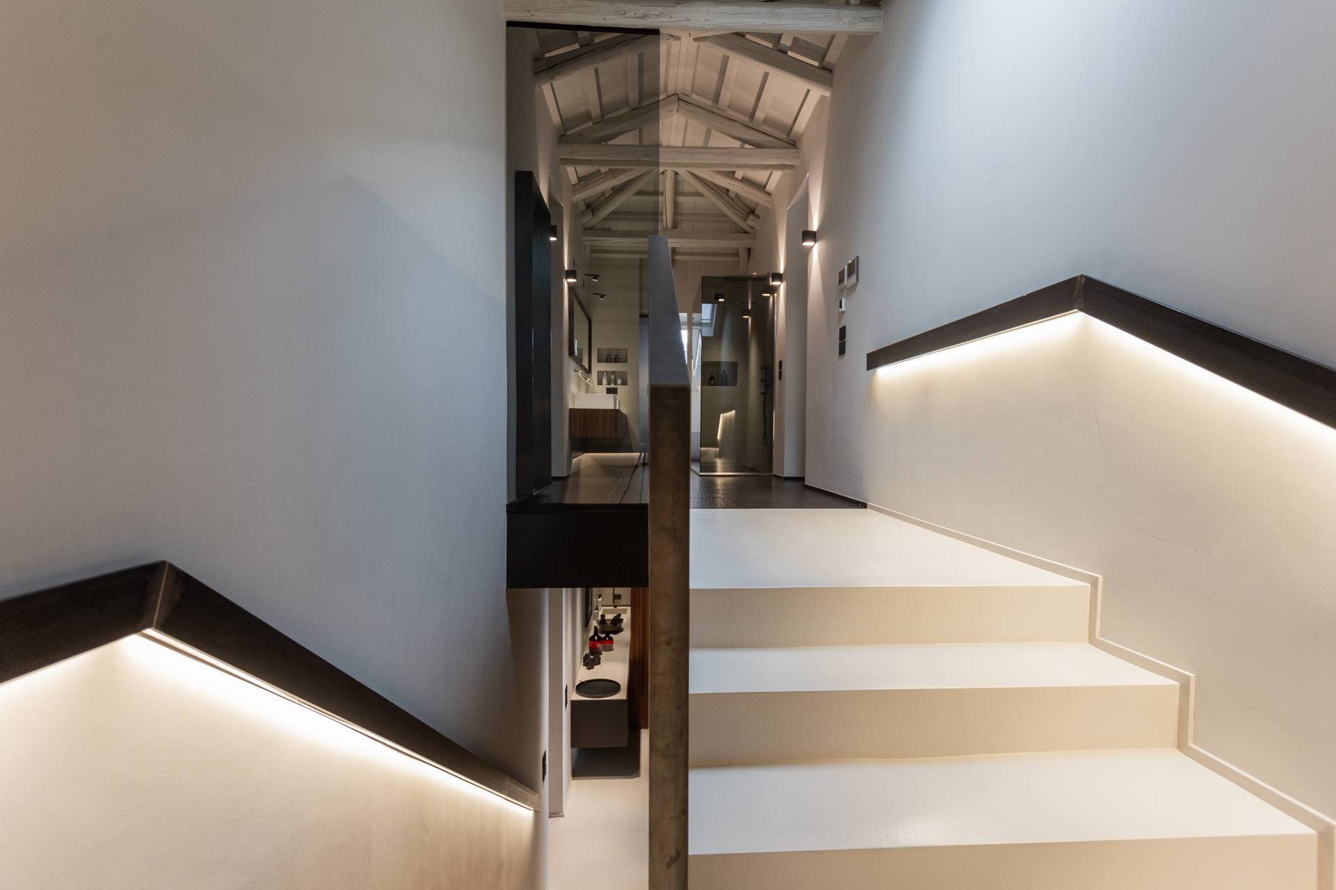 Il piano superiore, nel sottotetto, è destinato alla camera padronale. Una romantica suite caratterizzata dall’assenza di porte e di pareti che affaccia direttamente sul soggiorno e filtrata da parapetti in vetro fumè. Una grande doccia a vista, visibile già dalla scala, segnala la presenza di un bagno scenografico e minimale.