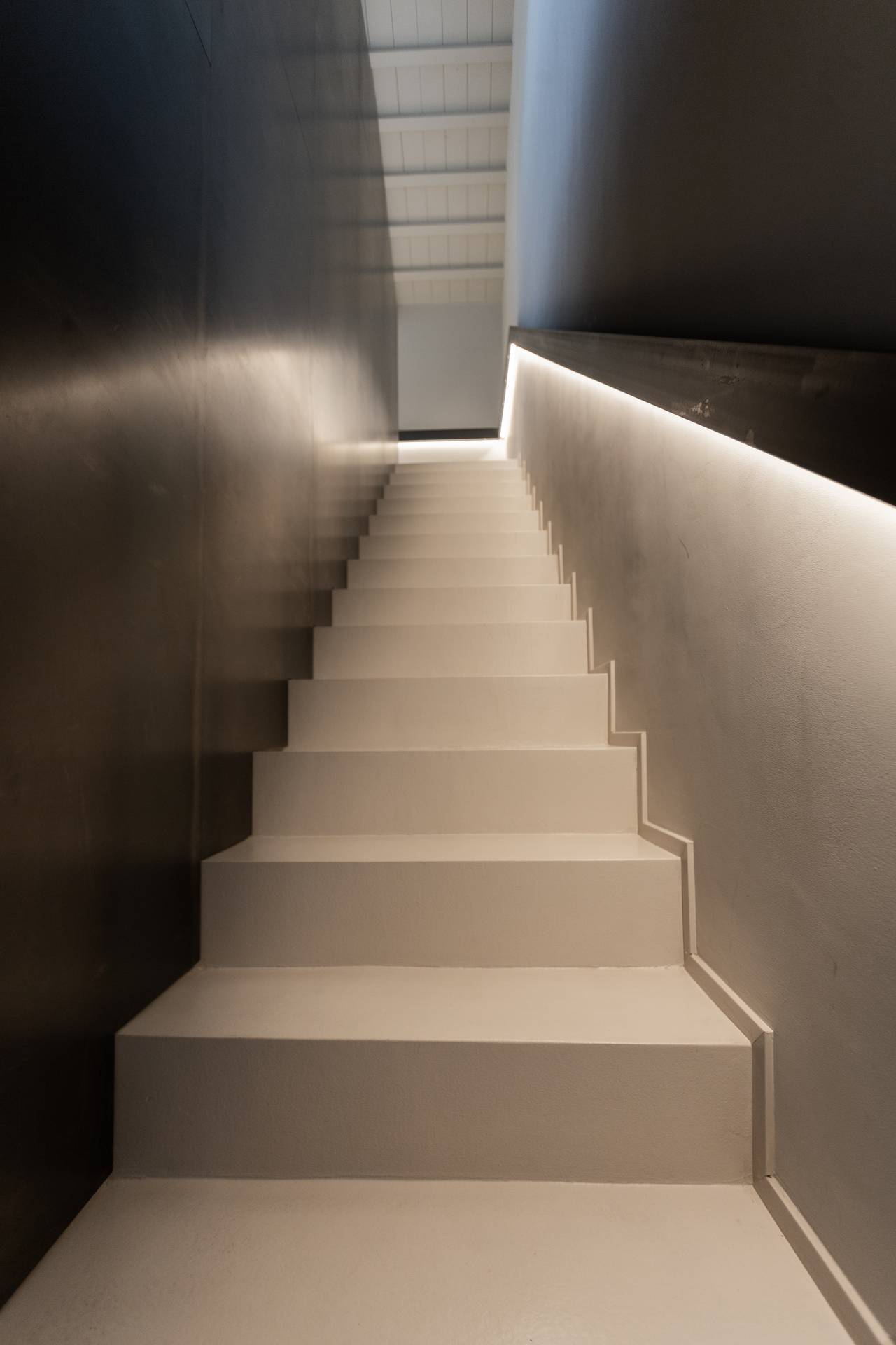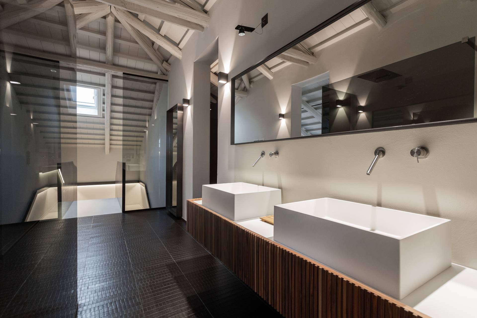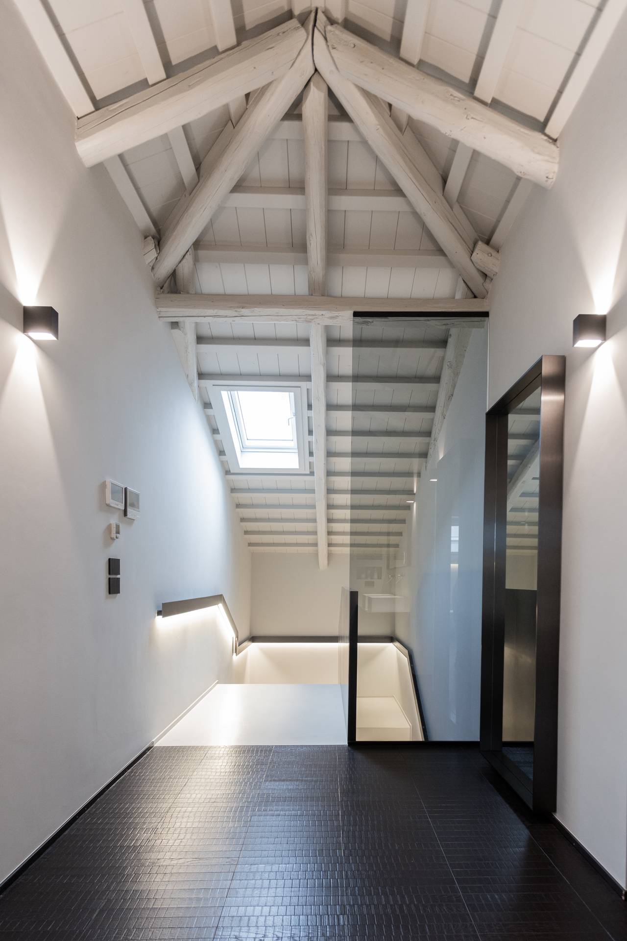 Il piano superiore, nel sottotetto, è destinato alla camera padronale. Una romantica suite caratterizzata dall’assenza di porte e di pareti che affaccia direttamente sul soggiorno e filtrata da parapetti in vetro fumè. Una grande doccia a vista, visibile già dalla scala, segnala la presenza di un bagno scenografico e minimale.